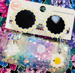 Girls White Flower Shaped Sunglasses W/// A Shimmery,, Glittery,, Sunflower Holding Case Set $5Polo, IL
