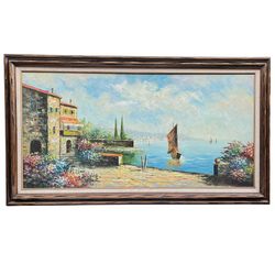 Signed Oil Painting Mediterranean Seaside Village Landscape w Sailboats 55" x 31”$180Clifton, NJ