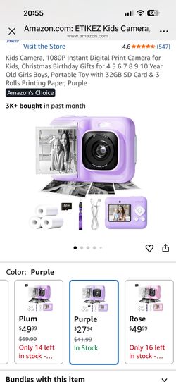 Kids Camera, 1080P Instant Digital Print Camera for Kids, Christmas Birthday Gifts for 4 5 6 7 8 9 10 Year Old Girls Boys, Portable Toy with 32GB SD C$15Arcadia, CA