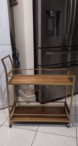 FirsTime & Co. Francesca Bar Cart Model ,featuring a gold metal frame, wood shelves, and bottle/glass.$65Miami, FL