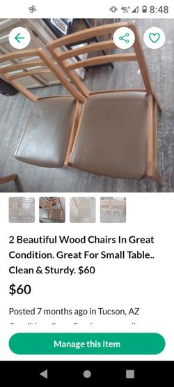 2 Beautiful Wood Chairs In Great Condition. Great For Small Table.. Clean & Sturdy. $60$60Tucson, AZ