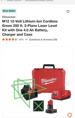 Milwaukee M12 12-Volt Lithium-Ion Cordless Green 250 ft. 3-Plane Laser Level Kit with One 4.0 Ah Battery, Charger and Case$470La Verne, CA