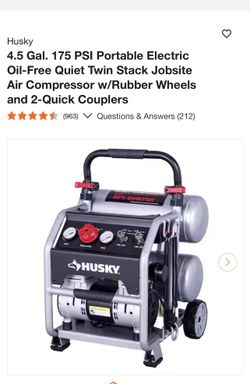 Husky 4.5 Gal. 175 PSI Portable Electric Oil-Free Quiet Twin Stack Jobsite Air Compressor w/Rubber Wheels and 2-Quick Couplers$180La Verne, CA