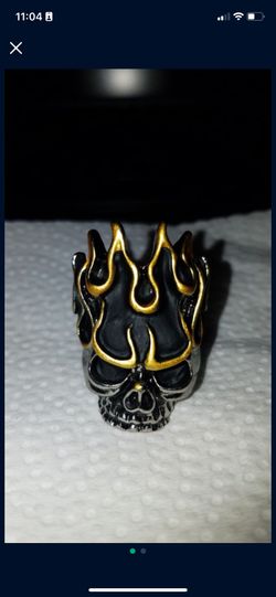 Size 9 solid Stainless steel with 18kt. GP on the flames. Flaming Skull ring.$25Smyrna, TN