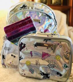 Holo Sticker Pocket Backpack & Wristlet and lunch box. New with tags. Girls love them! Backpack 11.5" W x 5.5" L x 16" H. Wristlet 9.75” x 6.25”. Lun$30Bakersfield, CA