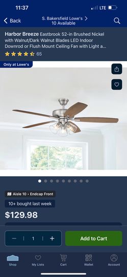 Harbor Breeze Eastbrook 52-in Brushed Nickel with Walnut/Dark Walnut Blades LED Indoor Downrod or Flush Mount Ceiling Fan$80Bakersfield, CA