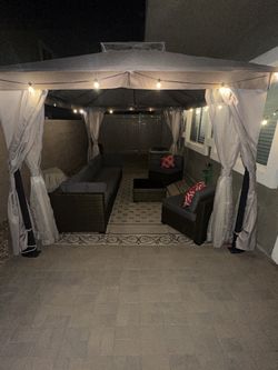 Backyard Brown Gazebo Setup With Fan Lights Hammock Mist System And Firepit$1,500Las Vegas, NV