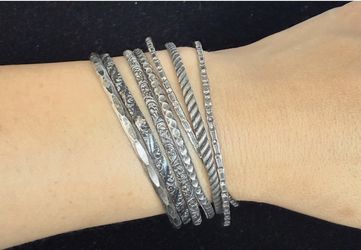 Vintage Set of 7 Sterling Silver Bangle Bracelet, Skinny Patterned Design$90La Habra Heights, CA