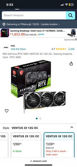 MSI GeForce RTX 3060 VENTUS 3X 12G OC, Gaming Graphics Card - RTX 3060$350Rochester, PA