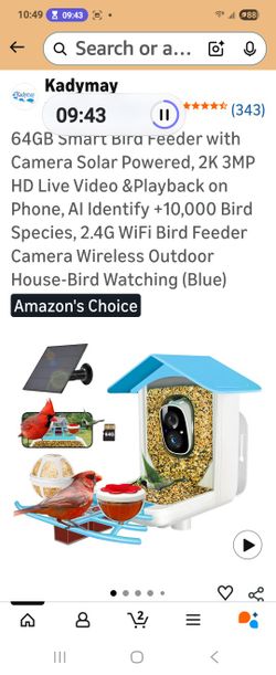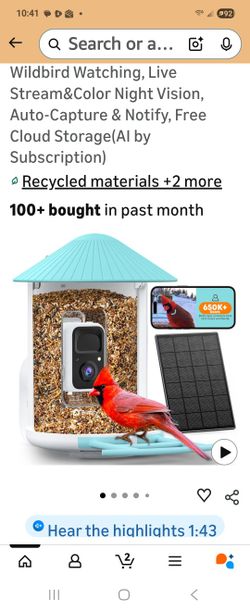 64GB Smart Bird Feeder with Camera Solar Powered, AI Identify 10K+ Bird Aves, 2K 3MP HD Live Video &Playback on Phone, 2.4G WiFi Birdhouse Camera Wire$40Sun City, AZ