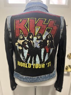 Talula Denim Jacket -size extra small, leatherette/vinyl black sleeves, KISS World Tour 1977 concert Tee with Red rhinestone embellishment $100Denver, CO