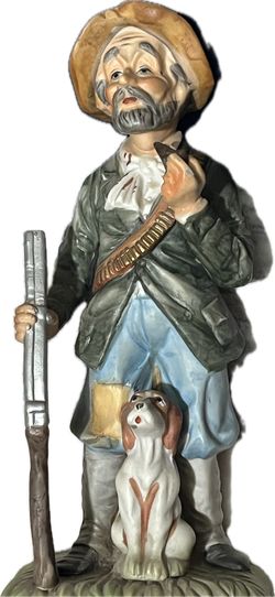 Vintage Porcelain Ceramic Bisque Figurine Man Smoking Pipe Holding Rifle Sitting Brown White Hunting Dog$10Fresno, CA