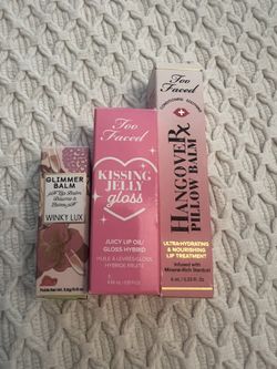 Set Of 3 Brand New Too Faced Hangover Pillow Balm & Kissing Jelly Gloss & Winky lux Glimmer Balm Lip Gloss Lip Balm Lipstick$25Visalia, CA
