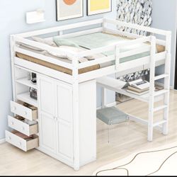 Wood Full Size Loft Bed with Built-in Desk and Wardrobe, 2 Shelves and 3 Storage Drawers, Wooden Loft Bed Frame with Ladder for Kids Teens, Whit$275Cincinnati, OH
