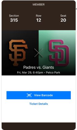 San Diego Padres vs San Francisco Giants March 29 $120Chula Vista, CA
