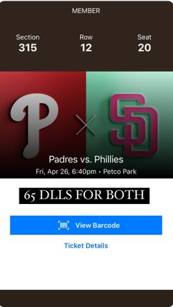 Padres vs Phillies 2 tickets$65Chula Vista, CA