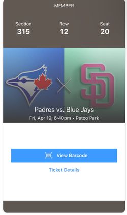 San Diego Padres vs Toronto Blue Jays April 19 (Two tickets)$80Chula Vista, CA