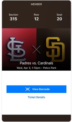 San Diego Padres vs St, Louis Cardinals 2 tickets$30Chula Vista, CA