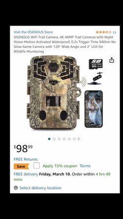 OSENOUS WiFi Trail Camera, 4K 48MP Trail Cameras with Night Vision Motion Activated, Waterproof.$80Collierville, TN