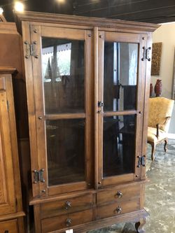 Rustic wood display cabinet with glass doors that lock and intricate carved details on side panels$485Altamonte Springs, FL