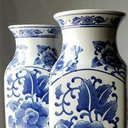 Large Vintage Chinoiserie Blue and White Vases - A Pair