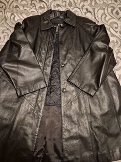 Black leather trench coat with quaited lining Size XL$40Willow Springs, IL