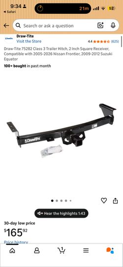 Draw-Tite 75282 Class 3 Trailer Hitch, 2 Inch Square Receiver, Compatible with 2005-2026 Nissan Frontier, 2009-2012 Suzuki Equator$125Sacramento, CA