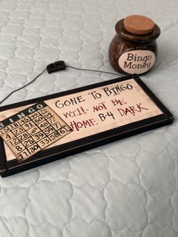 Bingo Themed Wooden Gone to Bingo Sign 12” x 5 1/2 “& Bingo Money Jar. 4” x14” Dia$10Hollywood, FL