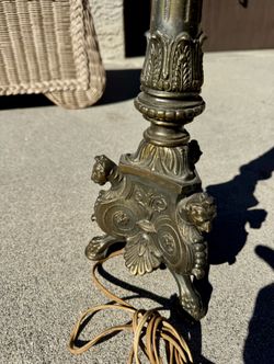 VINTAGE ORNATE BRASS PLATE FIGURAL LION HEAD LAMP TRIPOD BASE $95Monterey Park, CA