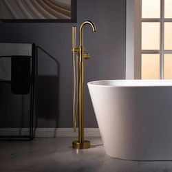 New In Box Contemporary Single Handle Floor Mount Freestanding Tub Filler Faucet with 2 Function Cylinder Style Hand Shower in Brushed Gold Finish,F00$180Las Vegas, NV