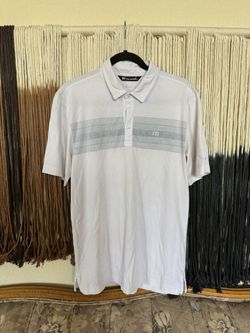 White Travis Mathew polo with teal, navy blue and grey stripes and a Kings River Golf and Country Club logo embroidered on the left arm$8Fowler, CA