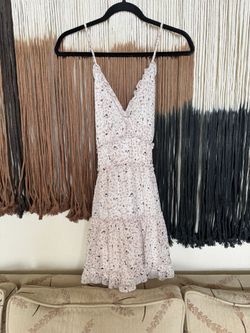 Pastel pink Baevely patterned mini summer dress with ruffles, adjustable straps and an open back with crisscross straps; perfect condition$15Fowler, CA