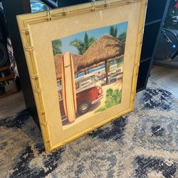 Iconic California Beach Memorabilia. Art 33 1/2 Inch Wide X 49 1/2 In Tall Framed Cali Retro Beach Culture Art In Bamboo Frame$200Huntington Beach, CA