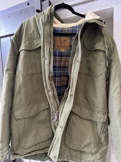 SoldWarm OUTDOOR LIFE parka jacket. Olive green color with a cozy sherpa lined hood. Plaid lining inside. Has lots of pockets and a zipper with snap closu$10Ontario, CA