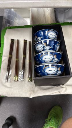 The bowls in the image are likely Japanese or Chinese porcelain bowls with a blue and white fish pattern.$35Chicago, IL
