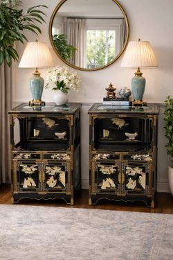 Set of 2 Vintage Asian Black Lacquer Chinoiserie Cabinets w/ Glass Tops $1,200Irvine, CA