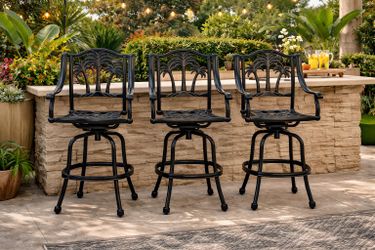 Set of 3 Outdoor Swivel Bar Stools – Black Aluminum – Palm Tree Design $399Santa Ana, CA