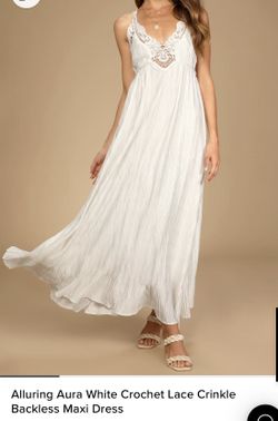 Alluring Aura White Crochet Lace Crinkle Backless Maxi Dress$50Fullerton, CA