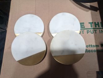 Lattoo Handmade White Marble and Brass Round Shape Set of 4 Tea Coasters for Home and Office