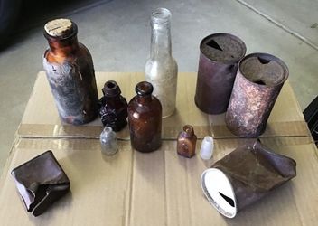 Lot of vintage glass bottles and cans. Around 18/19th century. One is a medicinal bottle, still has the old medicine tablets/pills inside. There’s a v$20Hesperia, CA