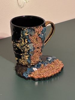 Handmade Black Resin Art Cup & Tray Set – Glittery Design Juego Hecho a Mano de Taza y Bandeja Negra – Diseño con Brillos de Resina $30Miami, FL