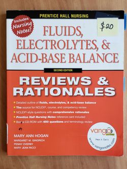 Fluids, Electrolytes, & Acid-Base Balance Second Edition Reviews & Rationales Prentice Hall Nursing Mary Ann Hogan$20Costa Mesa, CA