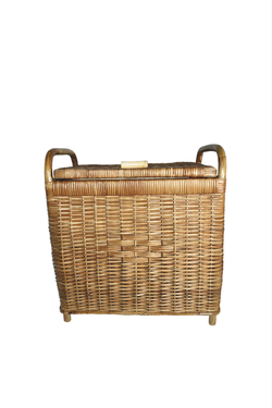 Small upholstered vintage lidded picnic basket crafted from natural brown wicker rattan with sturdy handles and feet.$75Canyon Country, CA