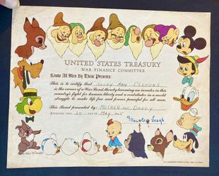 1944 WWII Walt Disney US Treasury War Bond Certificate In 1943 Disney pitched in to raise war funds and granted the Treasury Department permission to$200Rose Lodge, Oregon