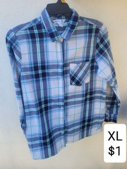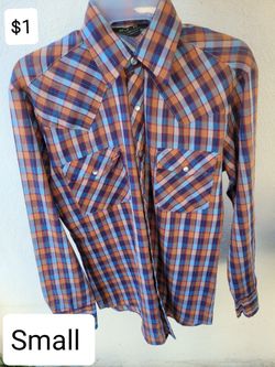 Rusty orange and blue blouse. Collar button up top. Checkered Long Sleeve. Blusa $1Huntington Park, CA