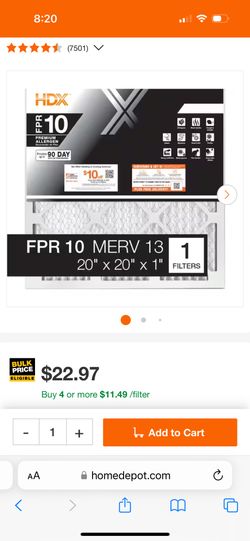 20 in. x 20 in. x 1 in. Premium Pleated Furnace Air Filter FPR 10, MERV 13$30Chandler, AZ