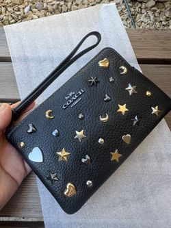 Coach Black Leather Corner Zip Wristlet with Star Moon Heart Rivets NWT$100Lakeside, CA