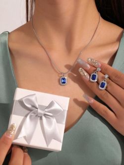 Blue Gemstone Square Pendant Necklace And Earrings Set, Elegant Wedding/Party Accessories, Gift Box Included$7Auburn, WA