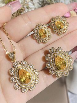 4pcs/set Gold-tone Yellow Gemstone Necklace, Earrings, Ring Suit For Wedding, Party & Costume$10Auburn, WA