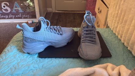 Steve Madden Women's Maxima sneakers in a monochromatic blue shade, featuring a knit upper, rhinestone embellishments on the side, and a chunky sole. $50Tampa, FL